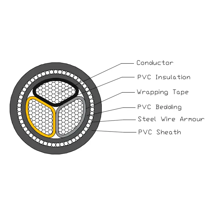 Le câble d'alimentation BS 6346 est composé d'un conducteur en cuivre T1R, d'une isolation en PVC, d'une literie en PVC, d'une armure de déversoirs en acier et d'une gaine en PVC.